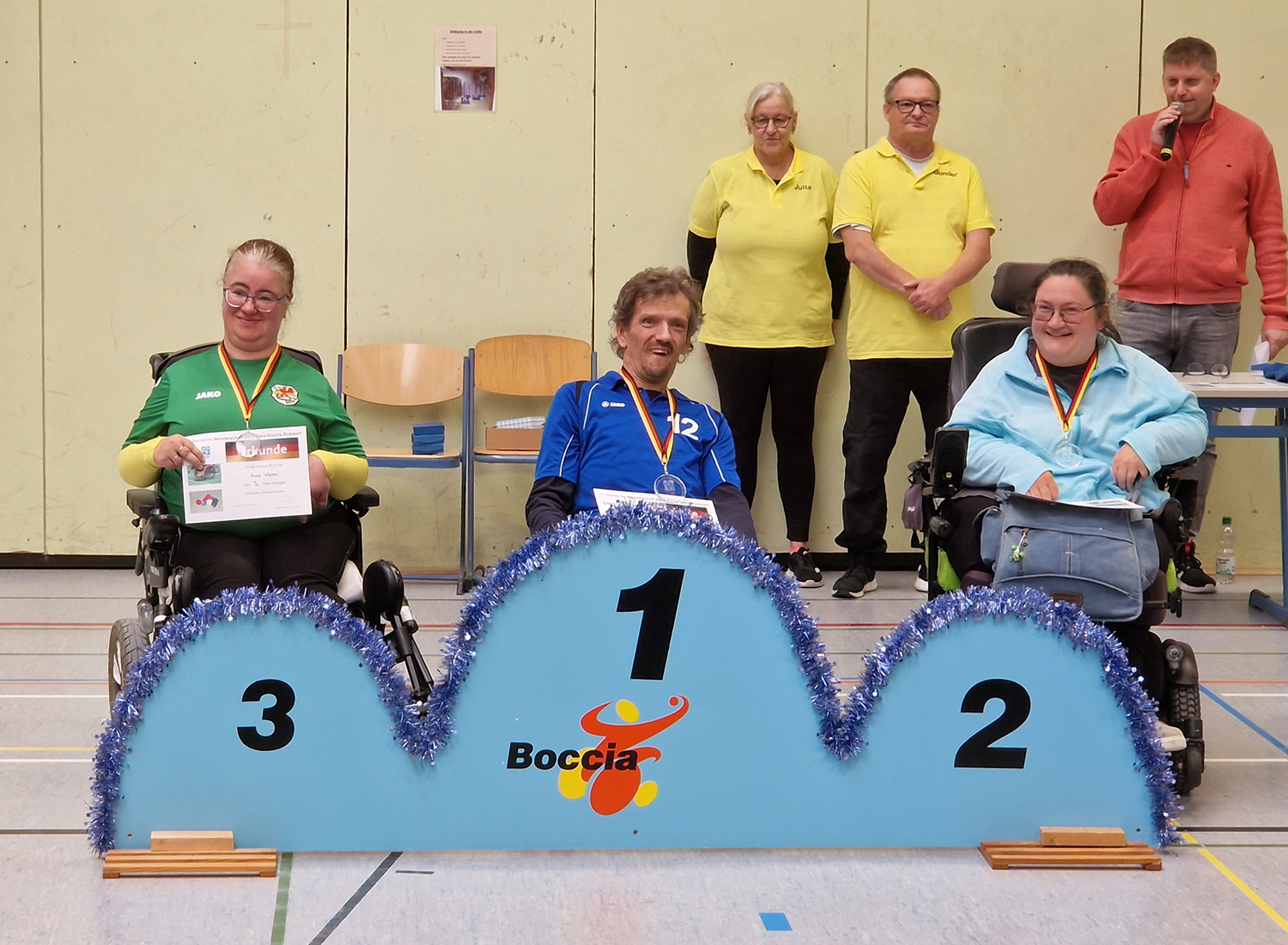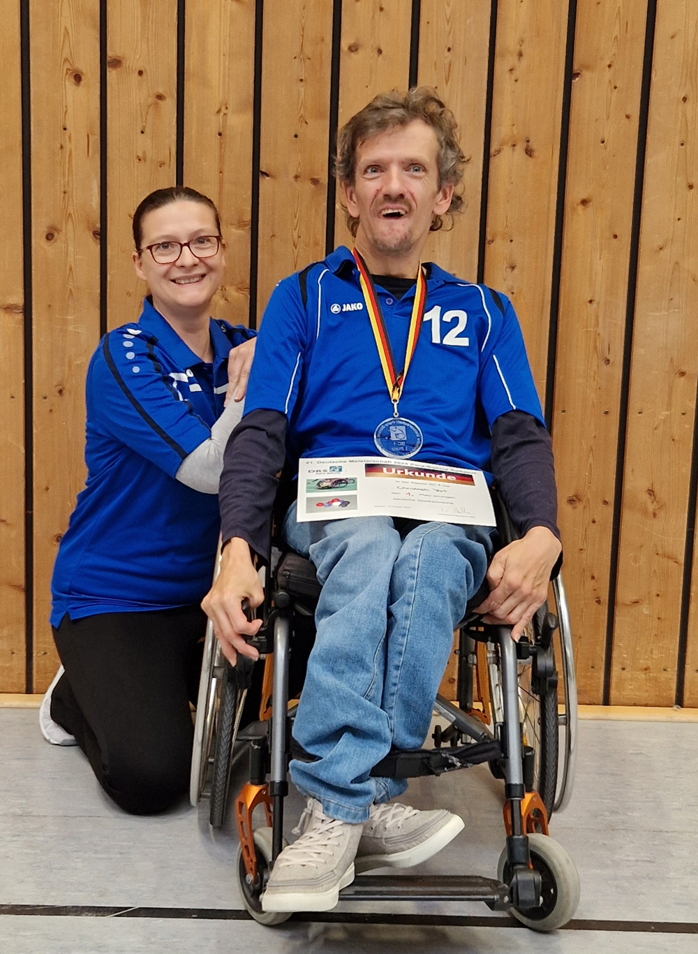 Die Urkunde und Goldmedaille überreichte der Leiter des Fachbereichs Boccia im DRS, Thomas Keller zusammen mit dem Vertreter des Ausrichters.